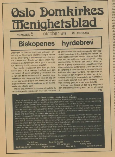 I 1978 skulle abortloven opp i Stortinget. Det kunne nå bli flertall for lovforslaget om selvbestemt abort. Den Norske Kirke gjorde det de kunne for å påvirke og stoppe forslaget. Biskopene skrev et «Hyrdebrev» som skulle leses opp av alle prester i alle kirker, søndag 4. juni 1978.