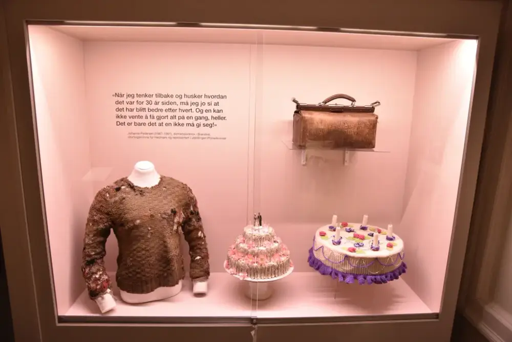 Midwife's bag: Used by Johanne Pedersen, midwife and member of the Norwegian parliament. Her bag was previously displayed in the exhibition Pionerkvinner (Women pioneers). The quote in the display was said by her: