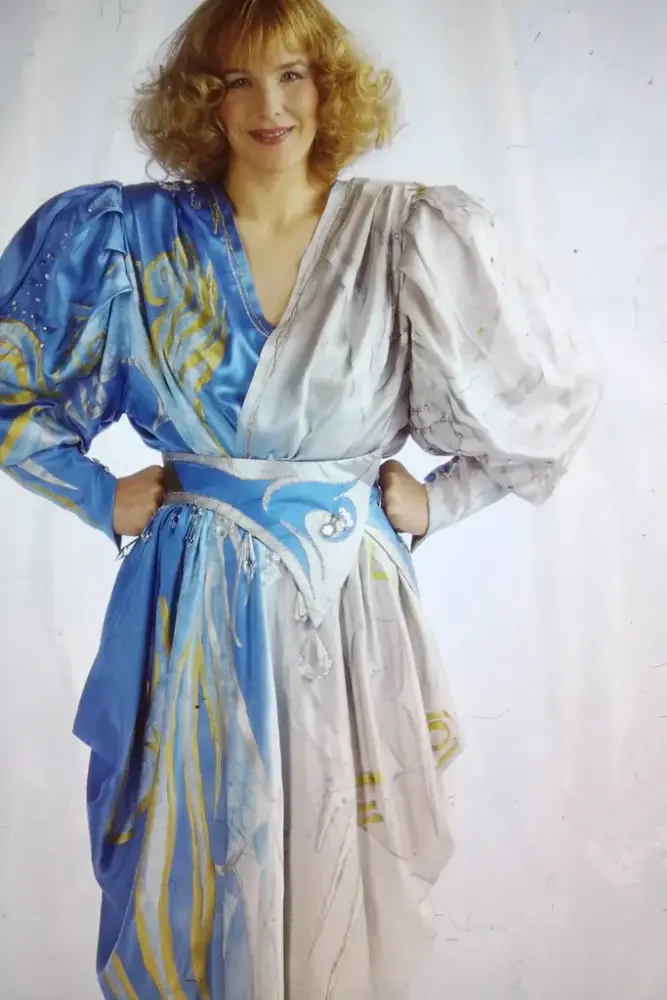 Skoene tilhører det fantastiske antrekket du ser på fotografiet. Det ble spesialdesignet til Monica av kunstneren Trude Waagaard fra Magnor på oppdrag av ukebladet Kvinner og klær i 1989.