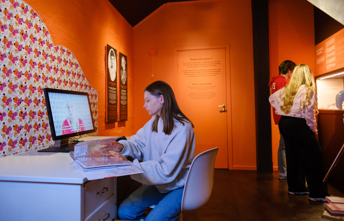 Elever ved Jordmoras skrivebord i utstillingen "HYSJ!". Ali Suliman, Anno museum - 2/2