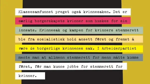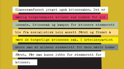Til tross for dette har offentligheten vært dominert av menn. Kvinner har måttet kjempe for en plass i det offentlige rom. Her forteller vi historier om hvordan denne kampen har artet seg i Norge fra midten av 1800-tallet fram til i dag. På mange felter har kvinnekampen vunnet fram. I vår tid finner vi kvinner i alle deler av offentligheten, og kvinner tar ledende stillinger i politikk og næringsliv. Men fortsatt finner vi store forskjeller i representasjon, lønn og holdninger.
