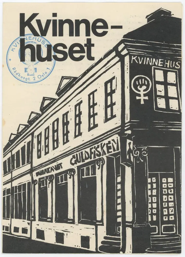 Huset lå i krysset mellom Rådhusgata og Skippergata. En forurenset og støvete del av Oslo, som på 1970-tallet var et prostitusjonsstrøk. Kvinnehuset lå i 2. etasje, over puben Guldfisken som hadde et nokså slitent klientell. Linoleumstrykk av Inge Ås. ©Inge Ås