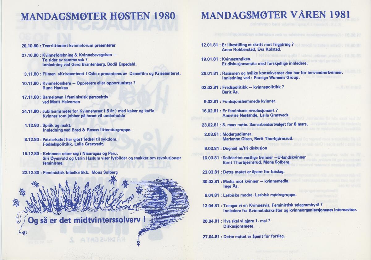 Mandagsmøtene på Kvinnehuset fylte et viktig behov for kvinnebevegelsen som helhet, her er programmet for møter i 1980-81.