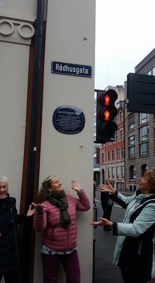 I 2020 ble Kvinnehuset hedret med et blått skilt. Ordfører Marianne Borgen gratulerer initiativtakerne til Kvinnehuset Liv Finstad og Inge Ås, som var med på markeringen. ©Kvinnemuseet