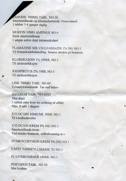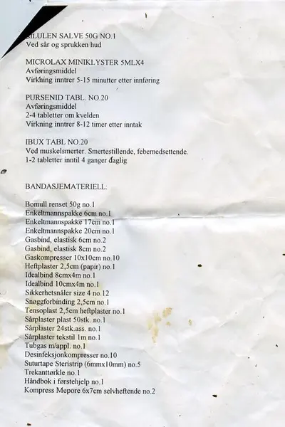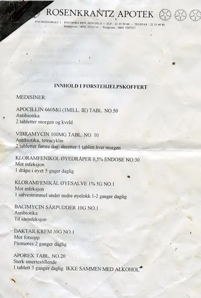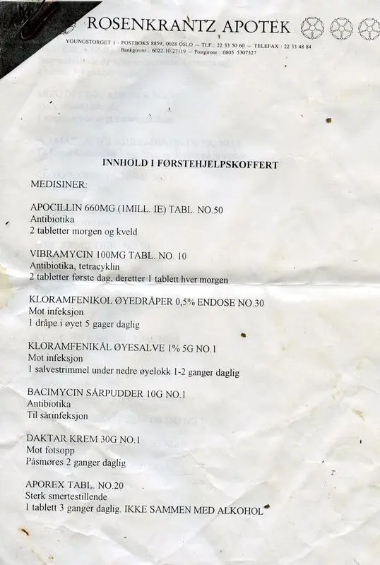 De eneste medisinene som ble brukt under ekspedisjonen var øyedråper mot snøblindhet, aspirin mot hodepine og forkjølelse, zinksalve på frostsår og plaster og sårsalve på gnagsår - og så klart solkrem med høy faktor!