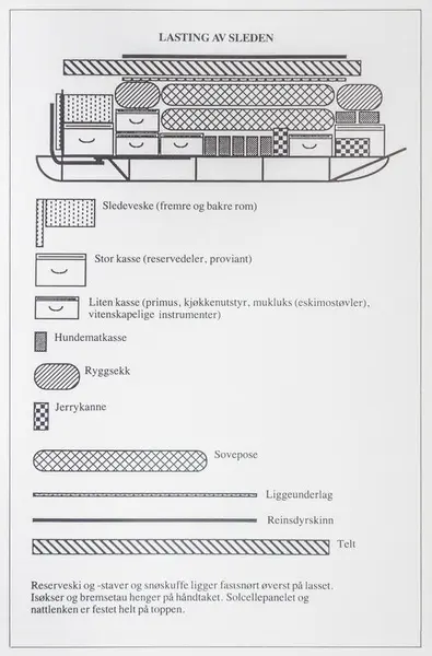 Utstyret som ble brukt på ekspedisjonen var vel utprøvd, basert på tradisjonelle modeller og metoder i polområdene. Utstyret ble imidlertid tilpasset moderne materialer som både var lettere og sterkere. Hver av de to hundespannene hadde følgende last:
