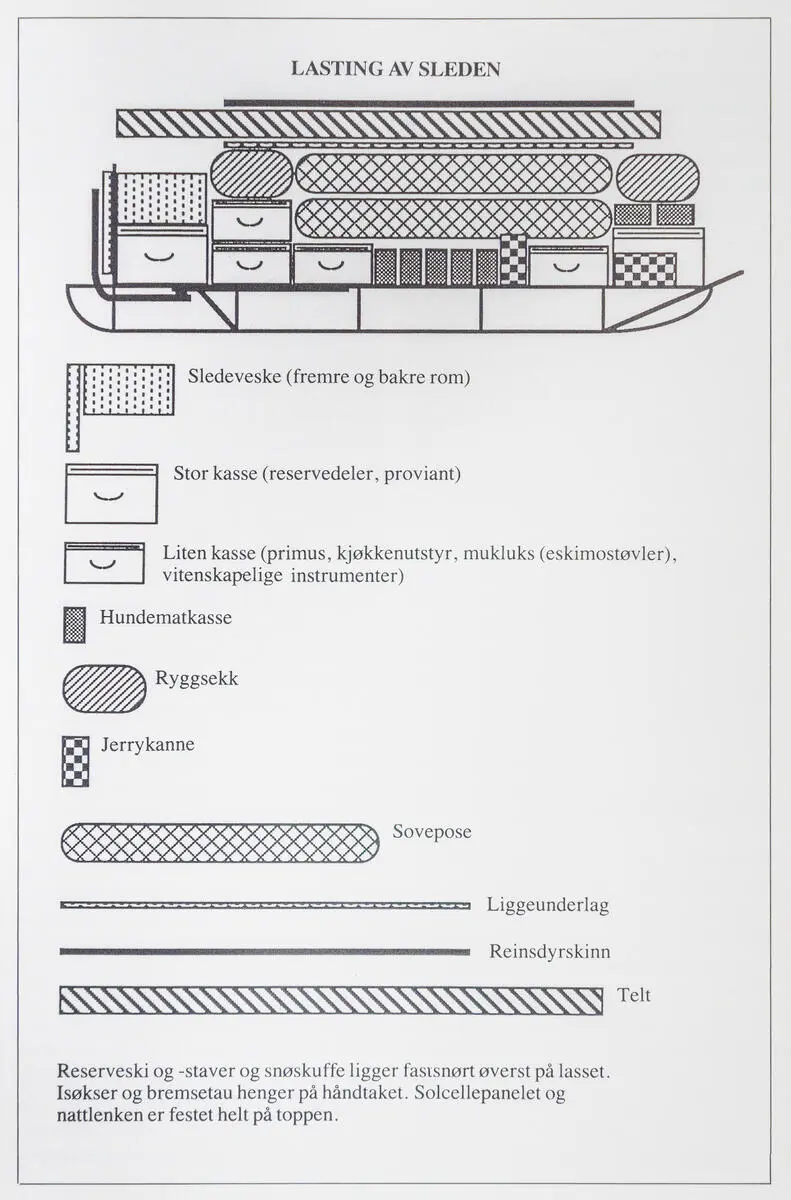 Sledeveske foran og bak med navigasjons- og radioutstyr, samt proviant og reserveutstyr.