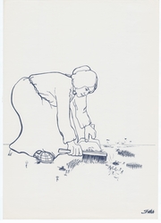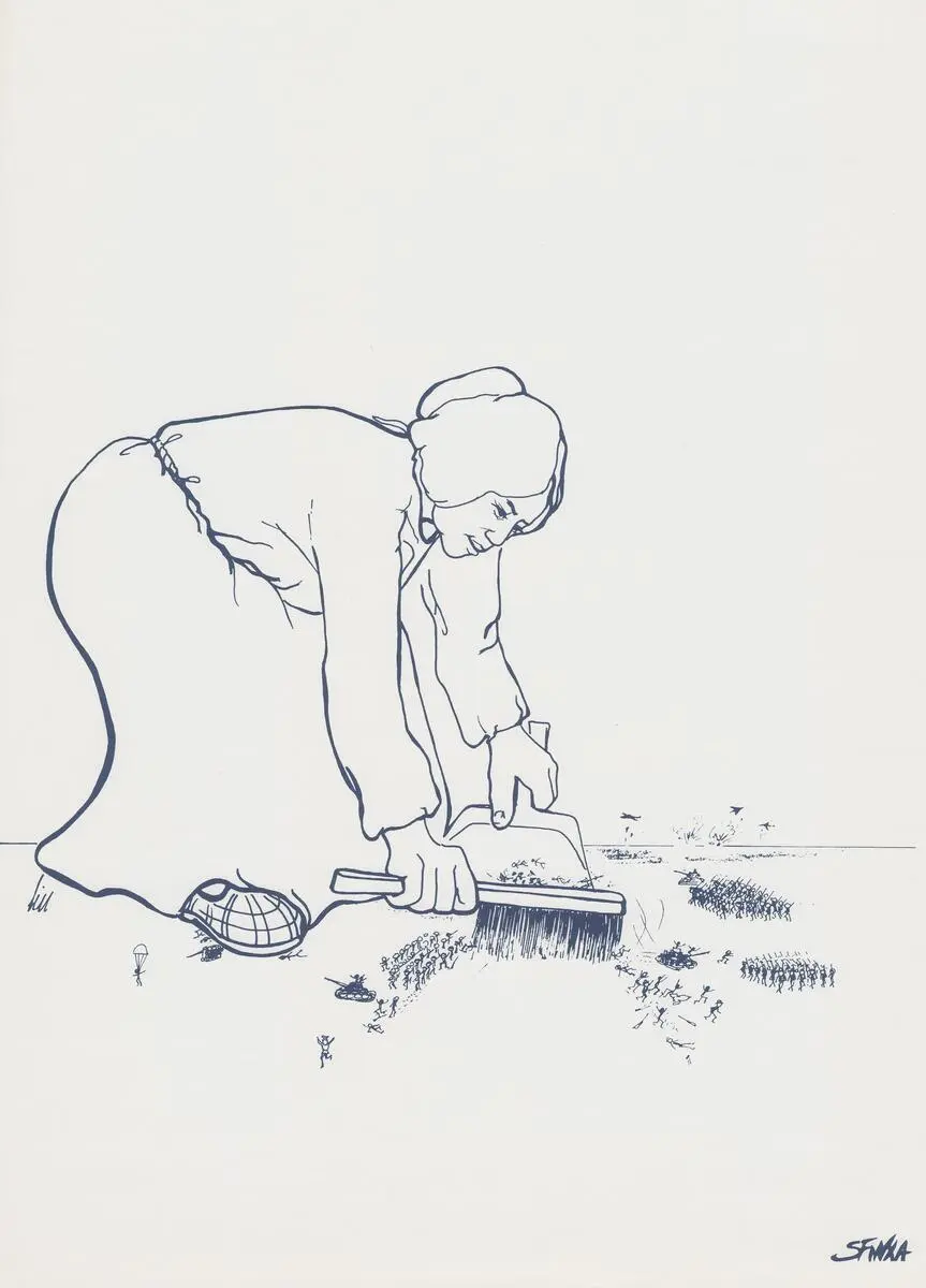 Liu Sancho fikk i oppdrag av Berit Ås å lage en plakat for Kvinner for Fred. Hun valgte å vise en kvinne som koster opp krigen, slik kvinner ofte må rydde opp etter gale menns handlinger både privat og offentlig.