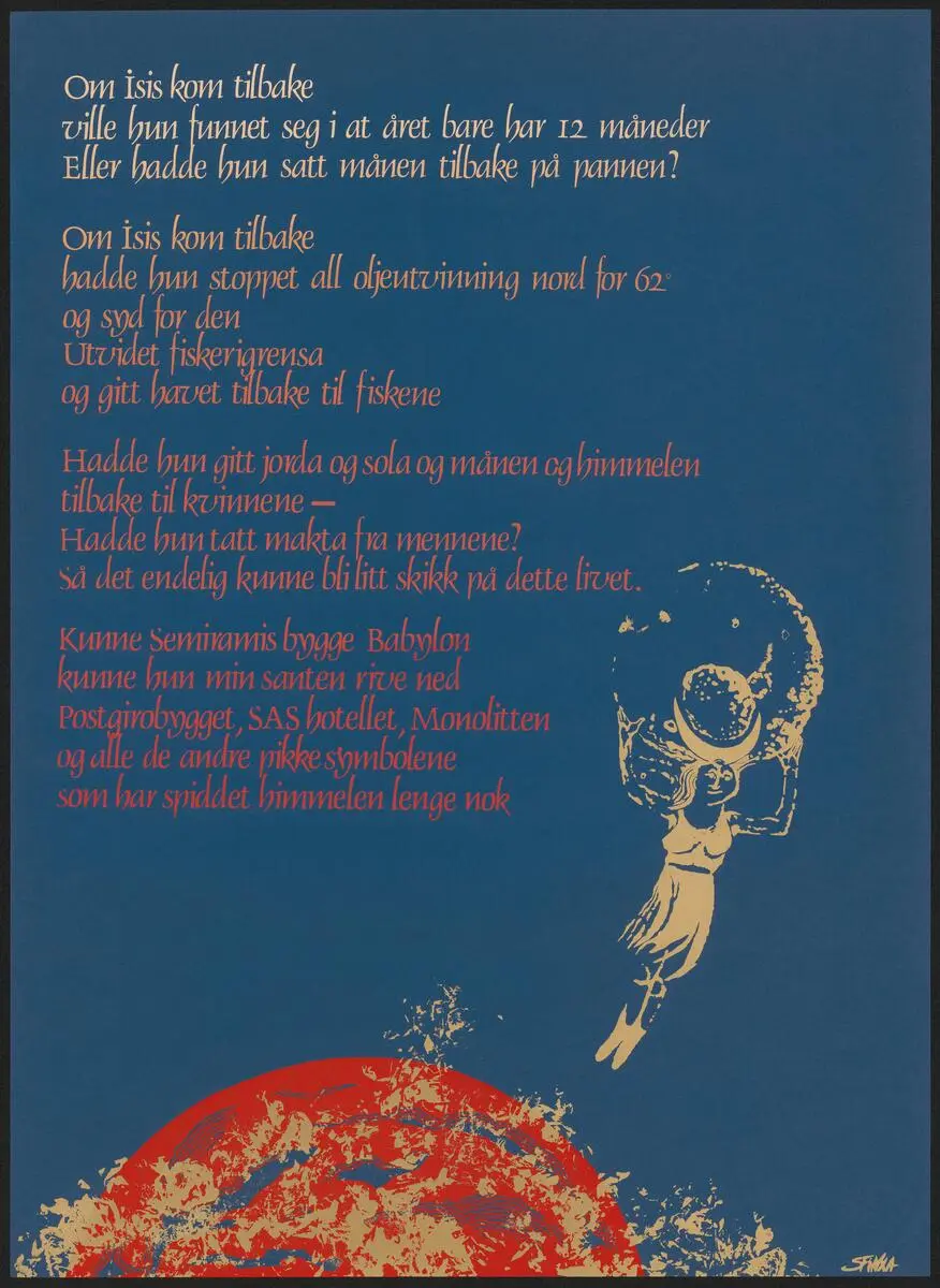 Vi var mange på 70-tallet som jaktet på våre formødre. Vi lærte om kvinnene i kvinnebevegelsens «første bølge» som kjempet fram stemmeretten for kvinner. Men vi måtte lenger tilbake for å se de lange linjene av kvinneundertrykkelse. Vi leste om Frøya og volvene i vikingetiden og vi studerte Egypt og fant den fascinerende gudinnen Isis. Isis og måneåret ble et symbol jeg brukte i mange av mine bilder og dikt. –Inge Ås